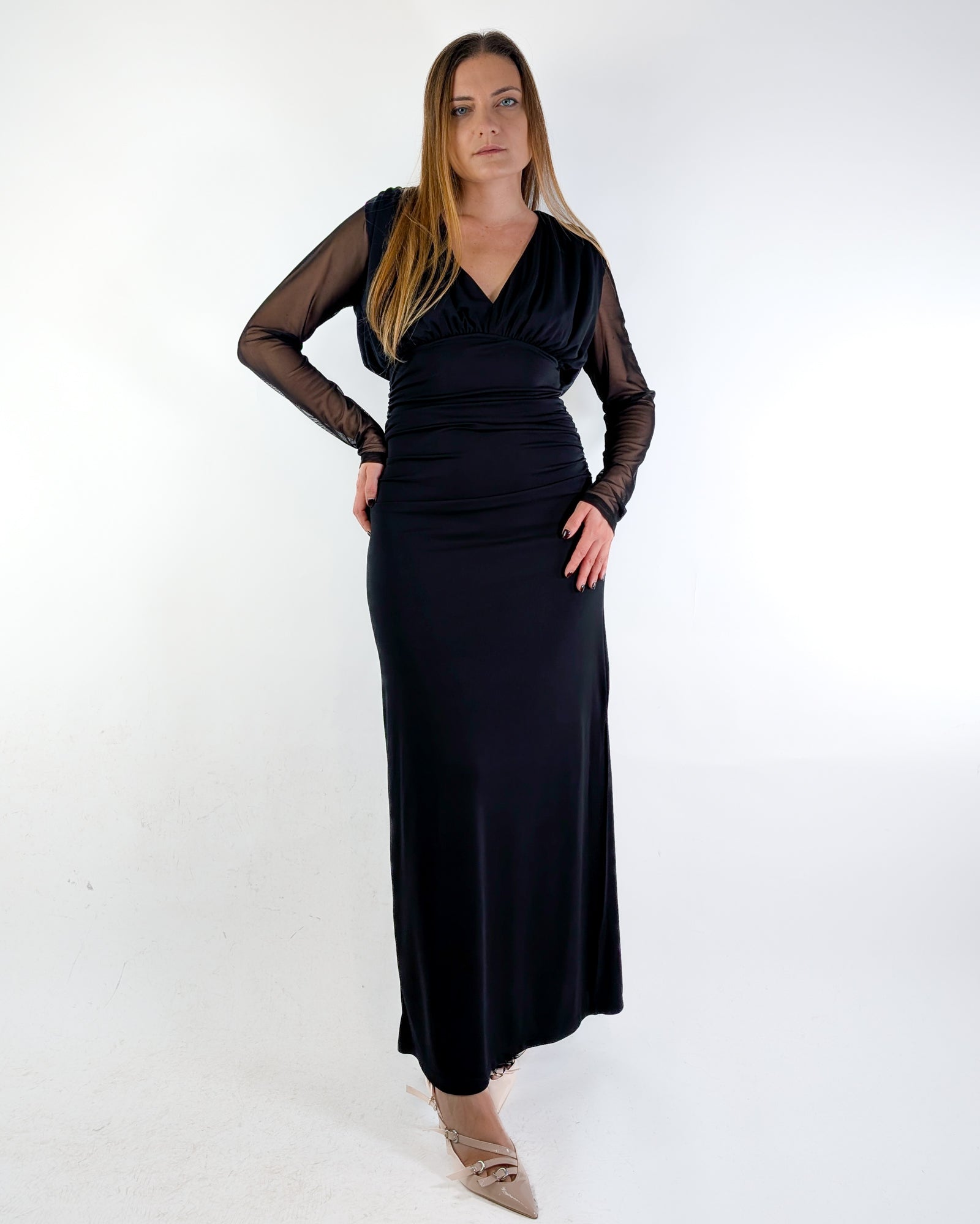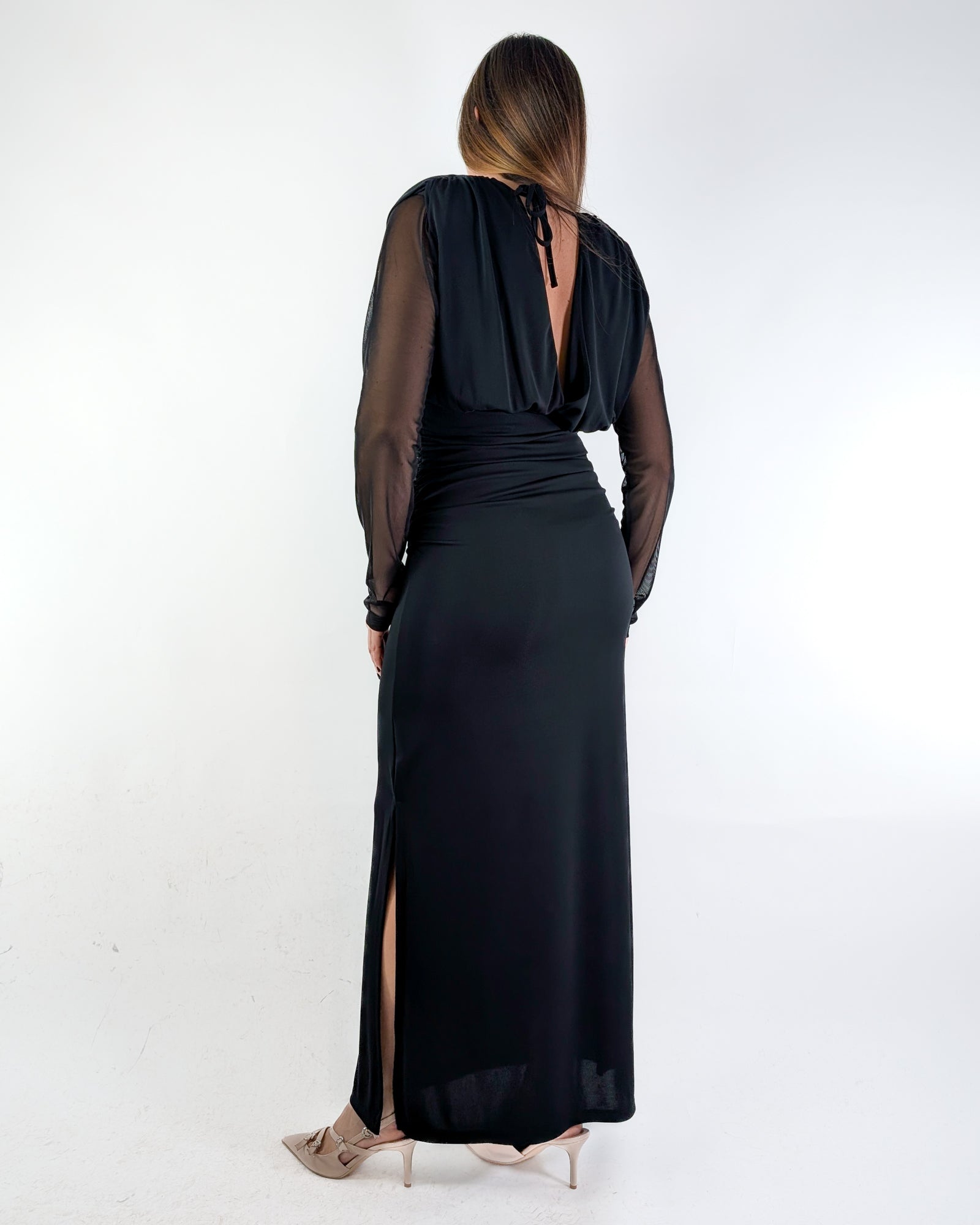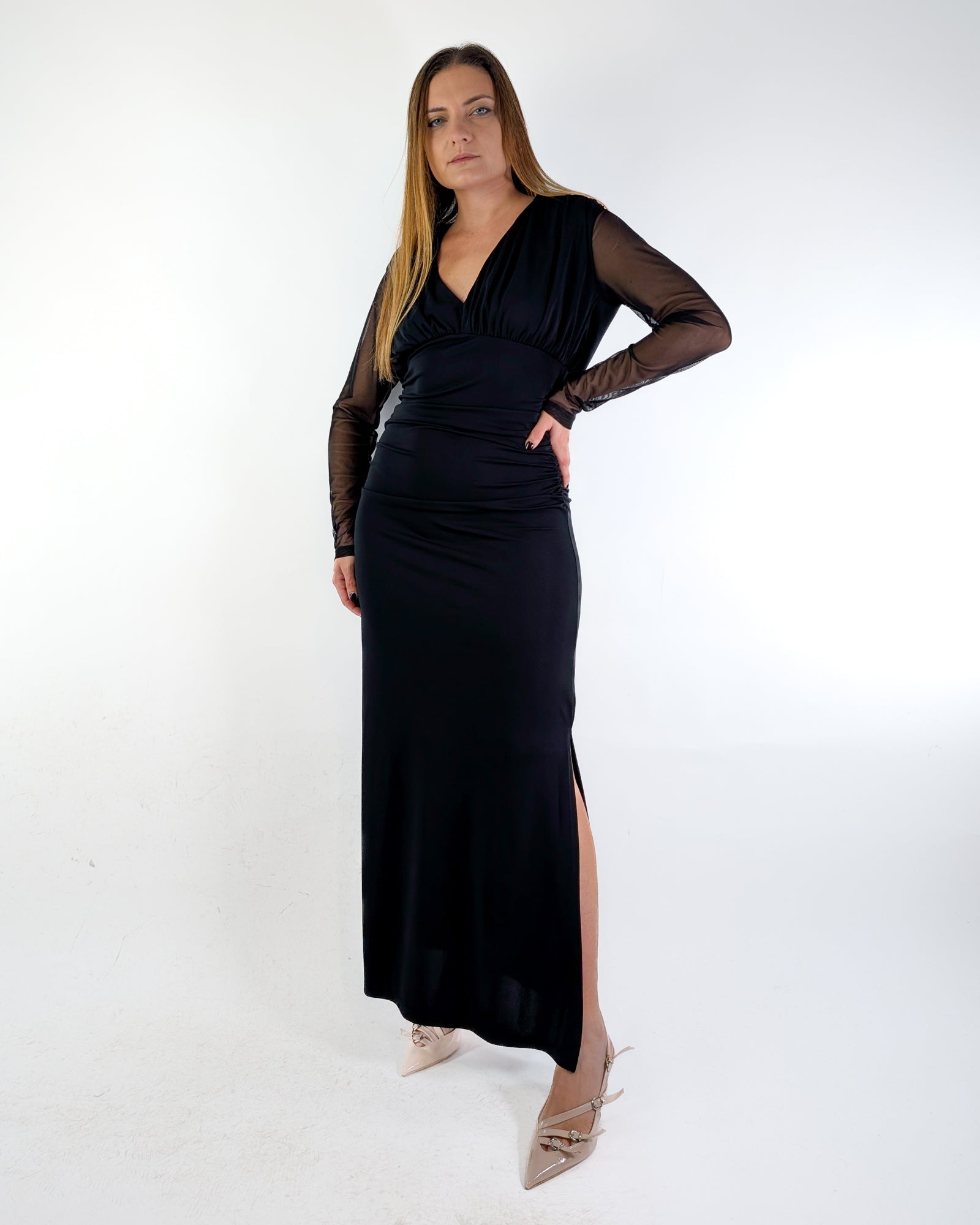 Abito lungo con spacco laterale.