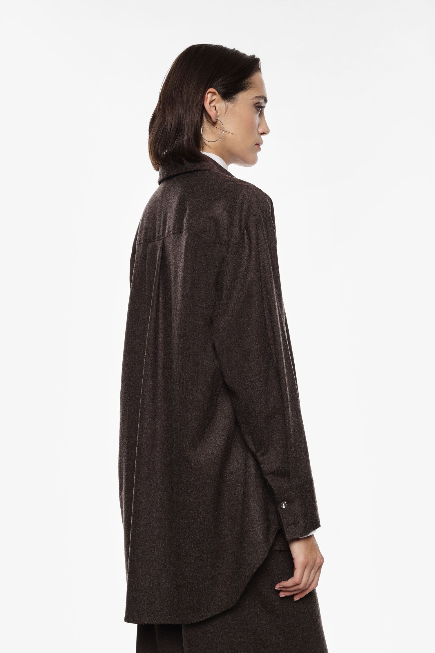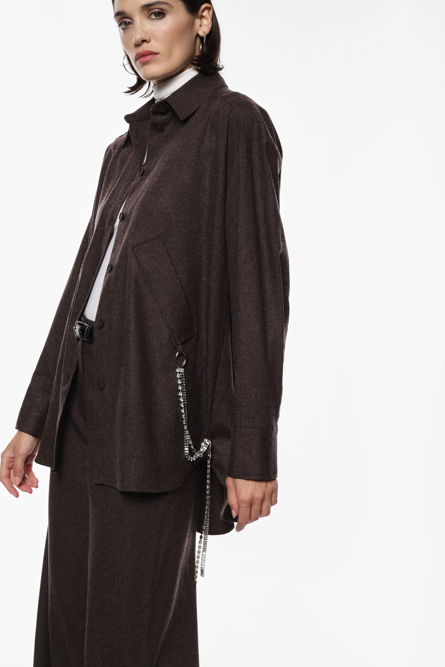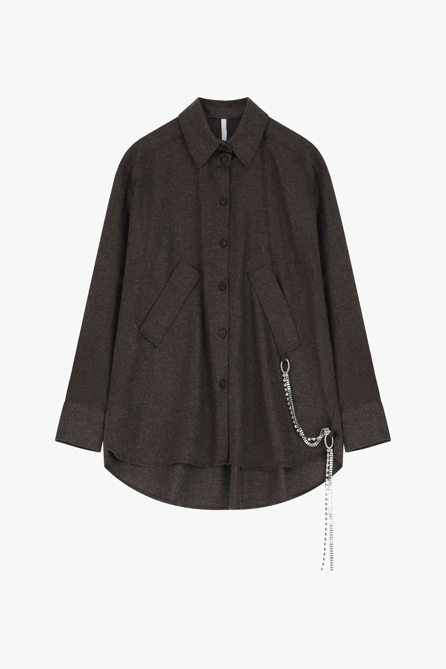 Camicia dal taglio lungo, impreziosita da un colletto classico e chiusura frontale con bottoni. Le ampie tasche applicate e la catena decorativa aggiungono una nota innovativa, offrendo numerose possibilità di espressione personale per uno stile contemporaneo e ricercato.