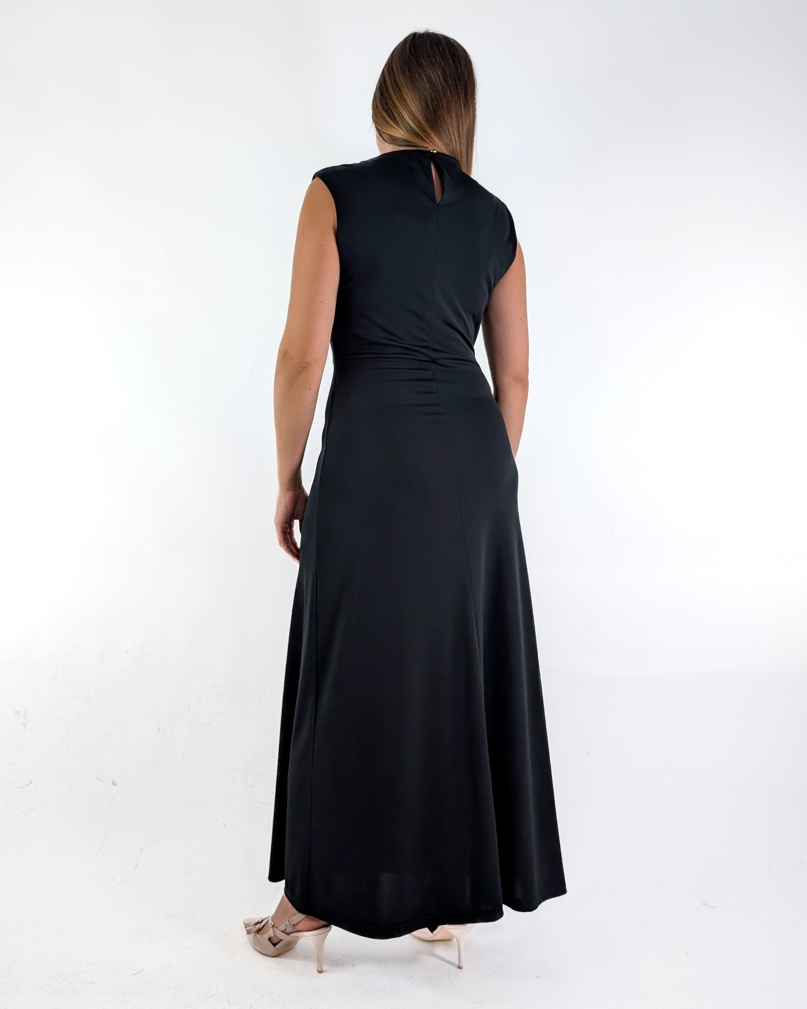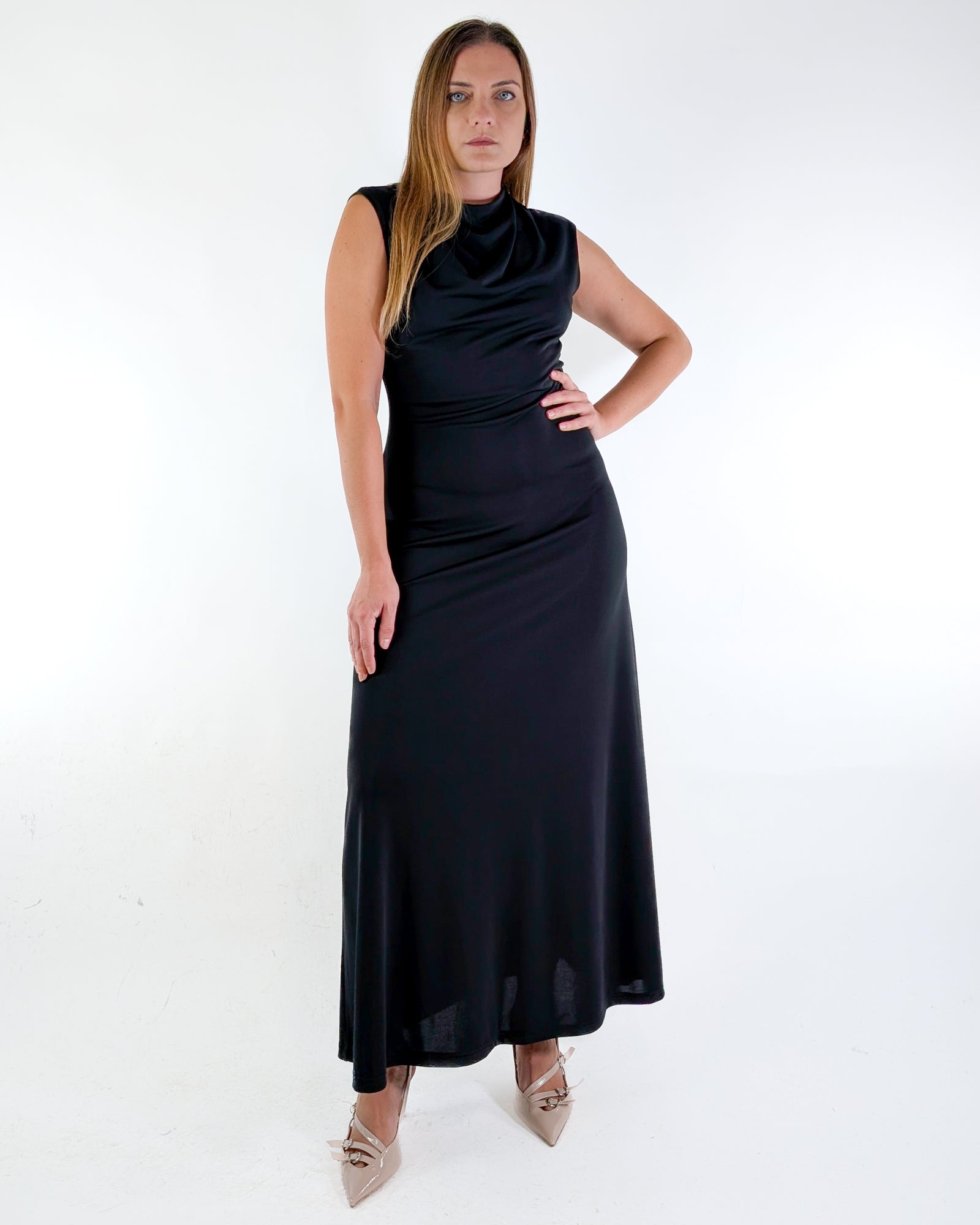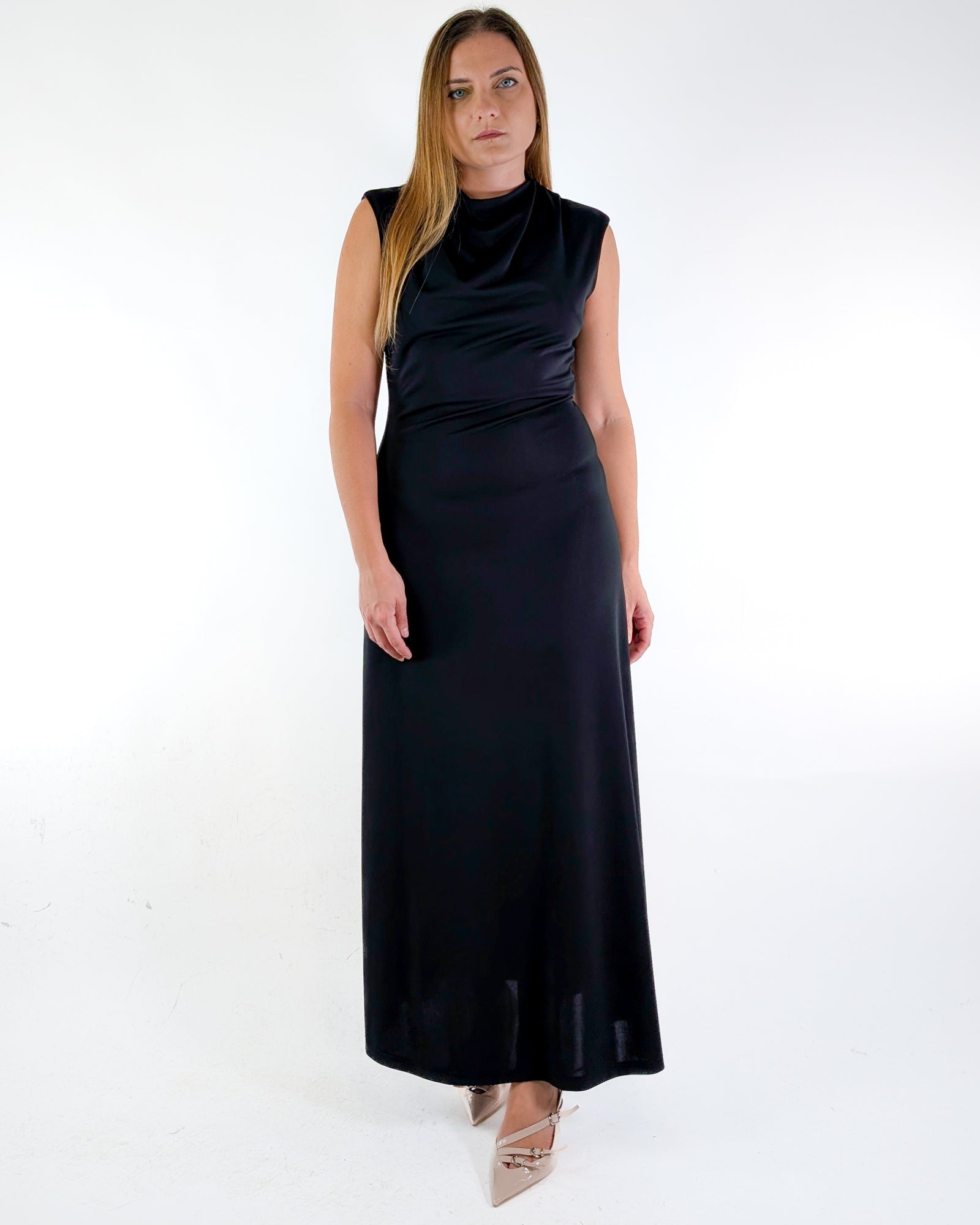 Abito lungo con drappeggio.