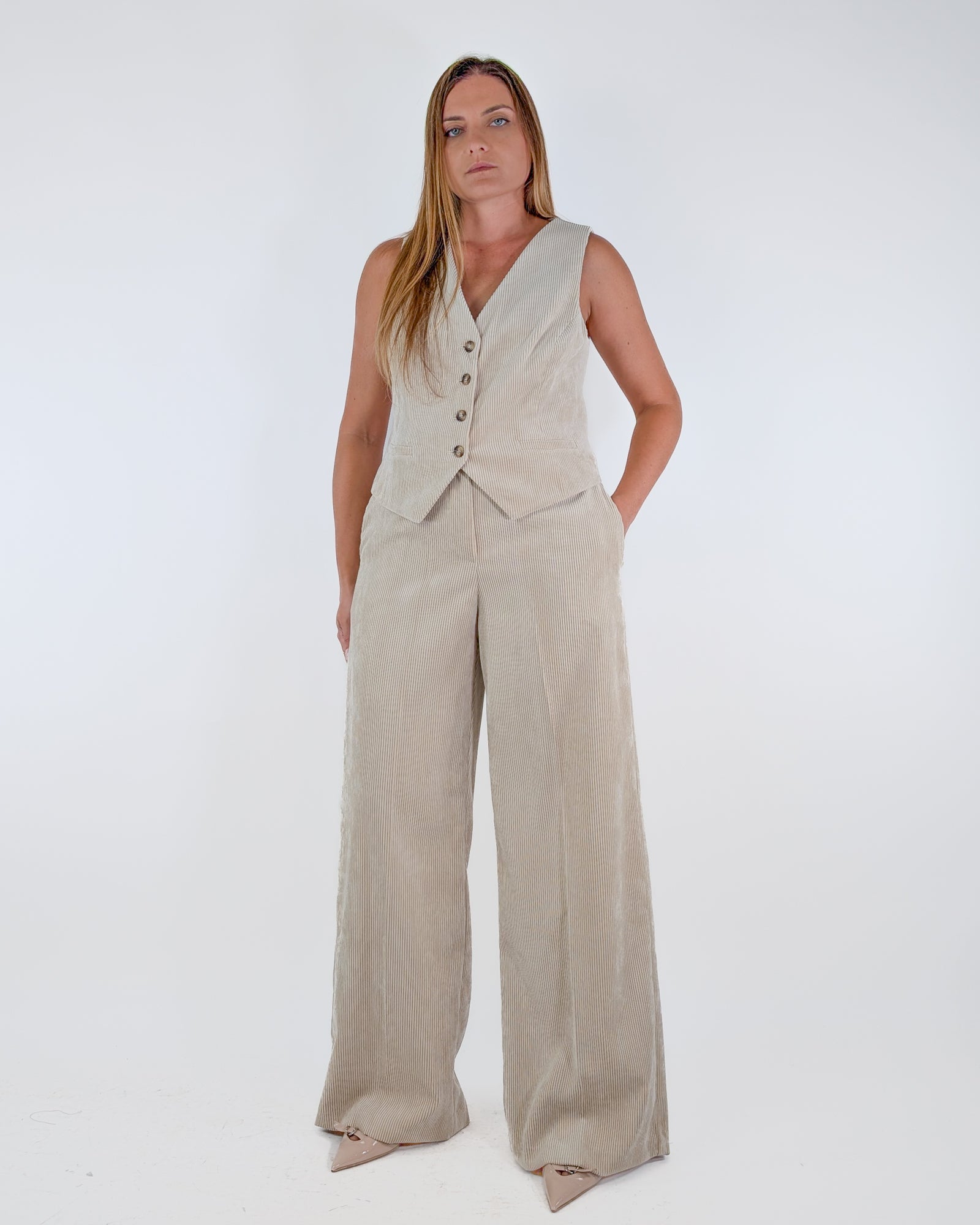 Pantalone palazzo in velluto a coste con cintura.