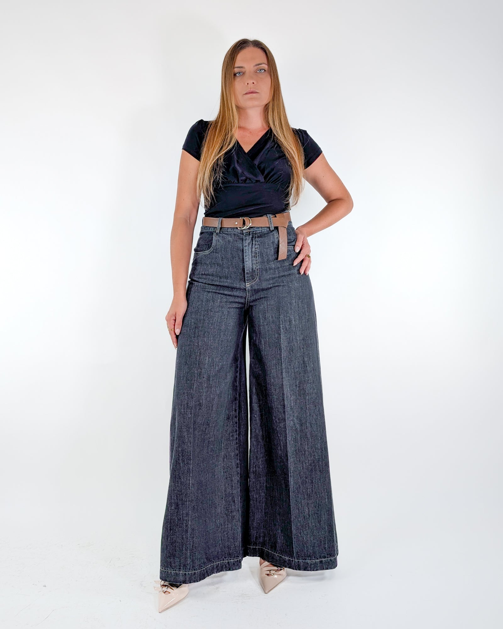 Jeans palazzo a vita alta con cintura.