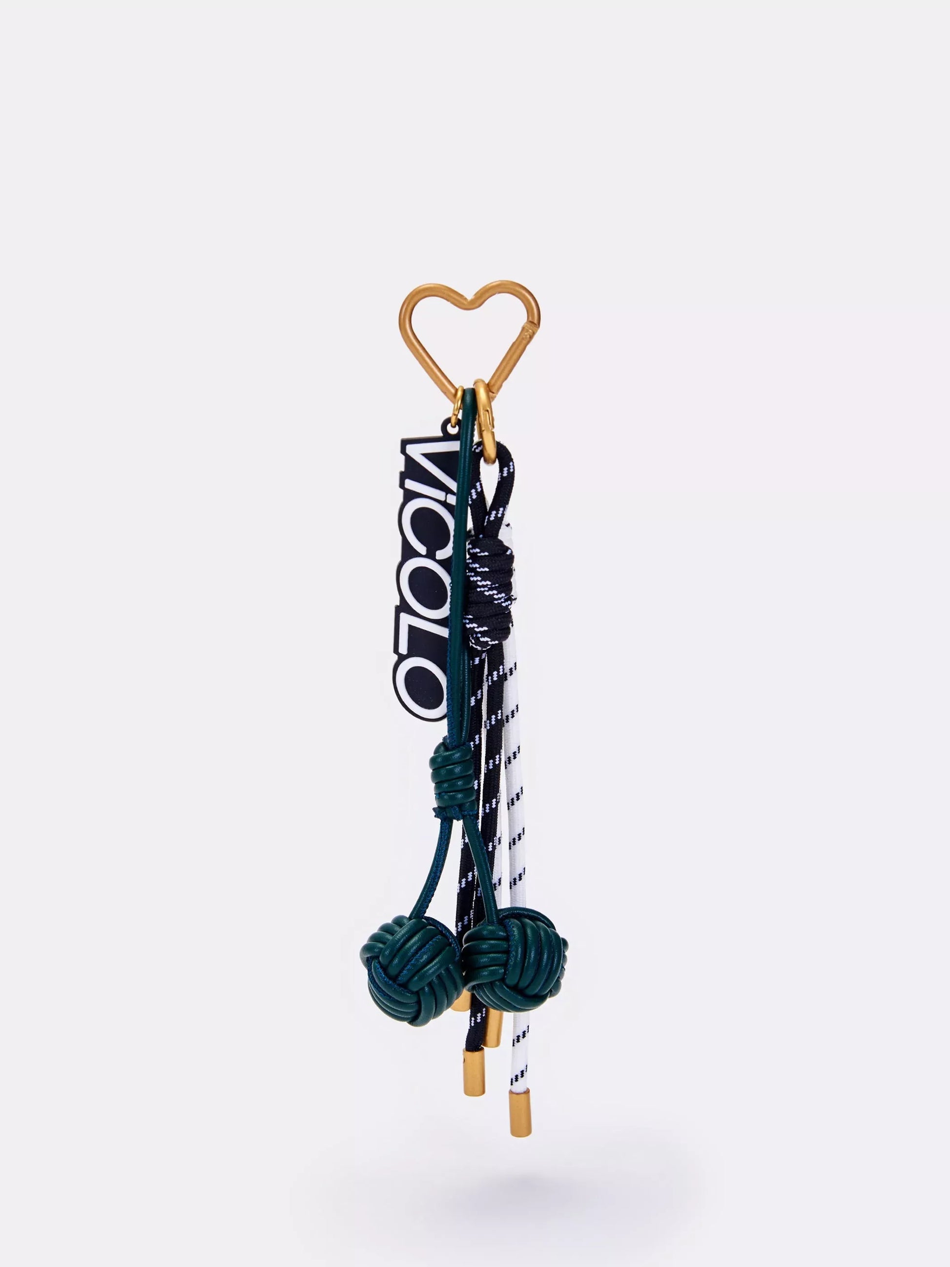 Charm con pendente in similpelle intrecciata, doppio cordino con cappuccio in metallo e charm Vicolo in gomma. Moschettone in metallo. Altezza 22 cm.