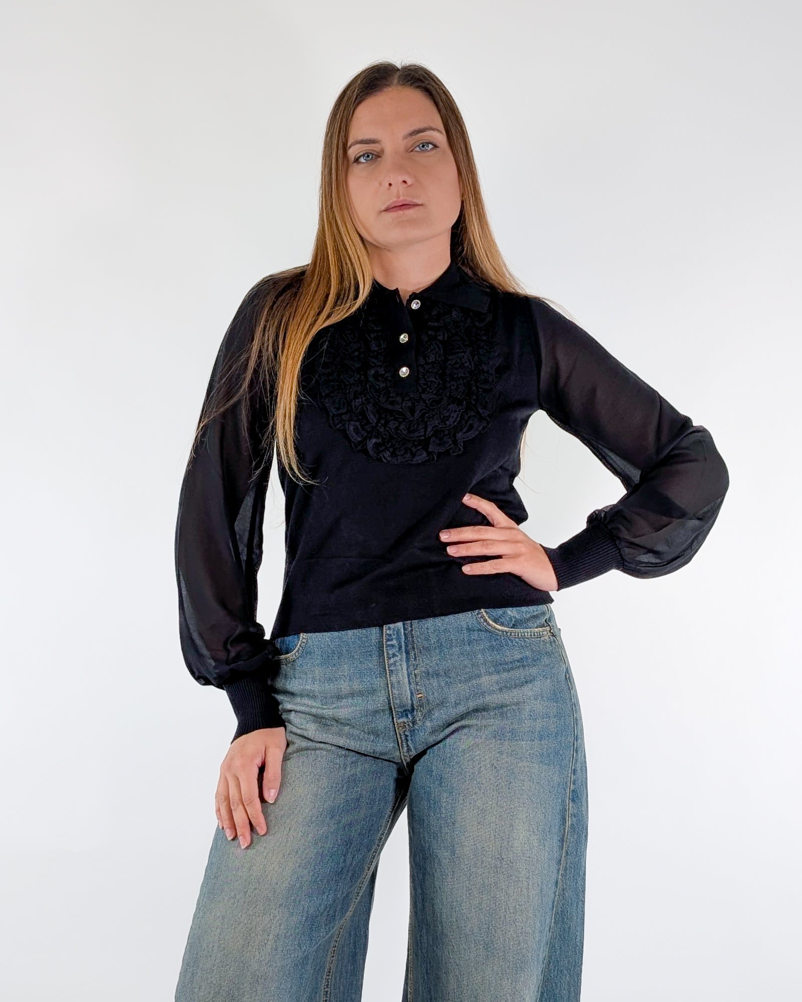 Maglia con rouche in pizzo e bottoncini gioiello.