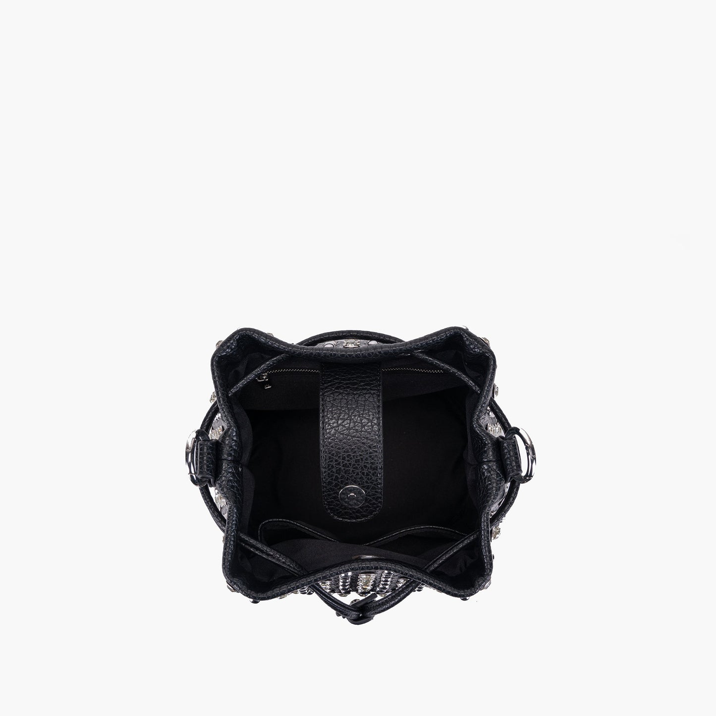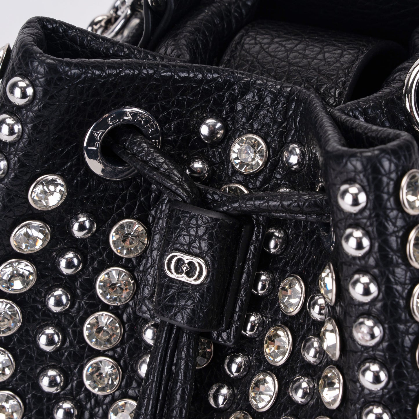 Secchiello Mirror in ecopelle martellata con borchie e strass applicate, manico e tracolla rimovibili.