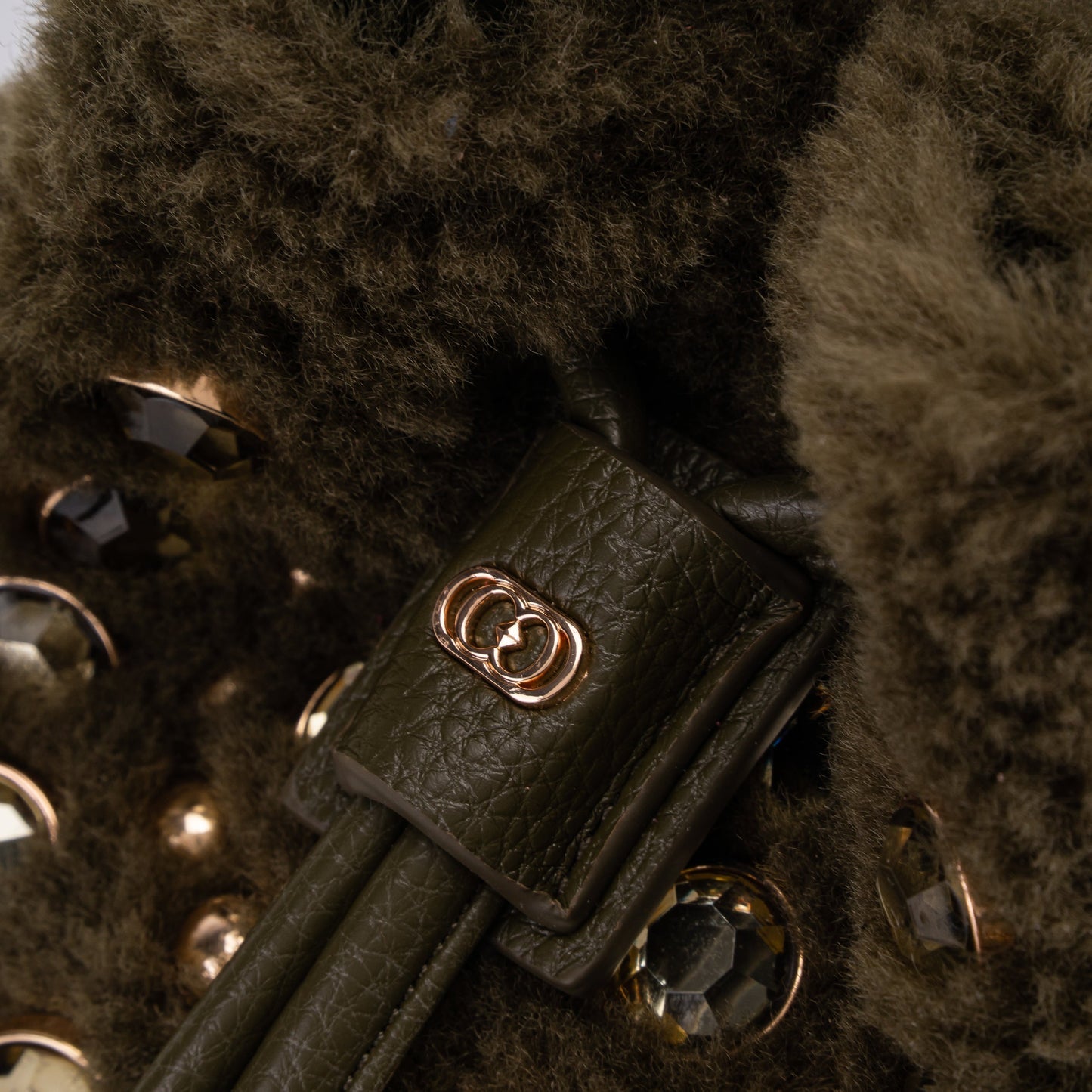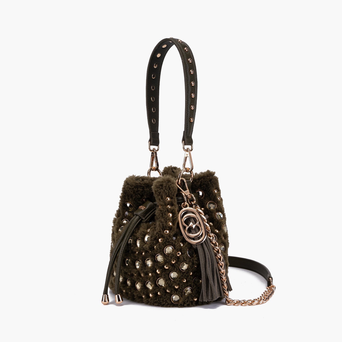 Secchiello piccolo in eco pelliccia con strass e borchie applicate, manico e tracolla rimovibile.
