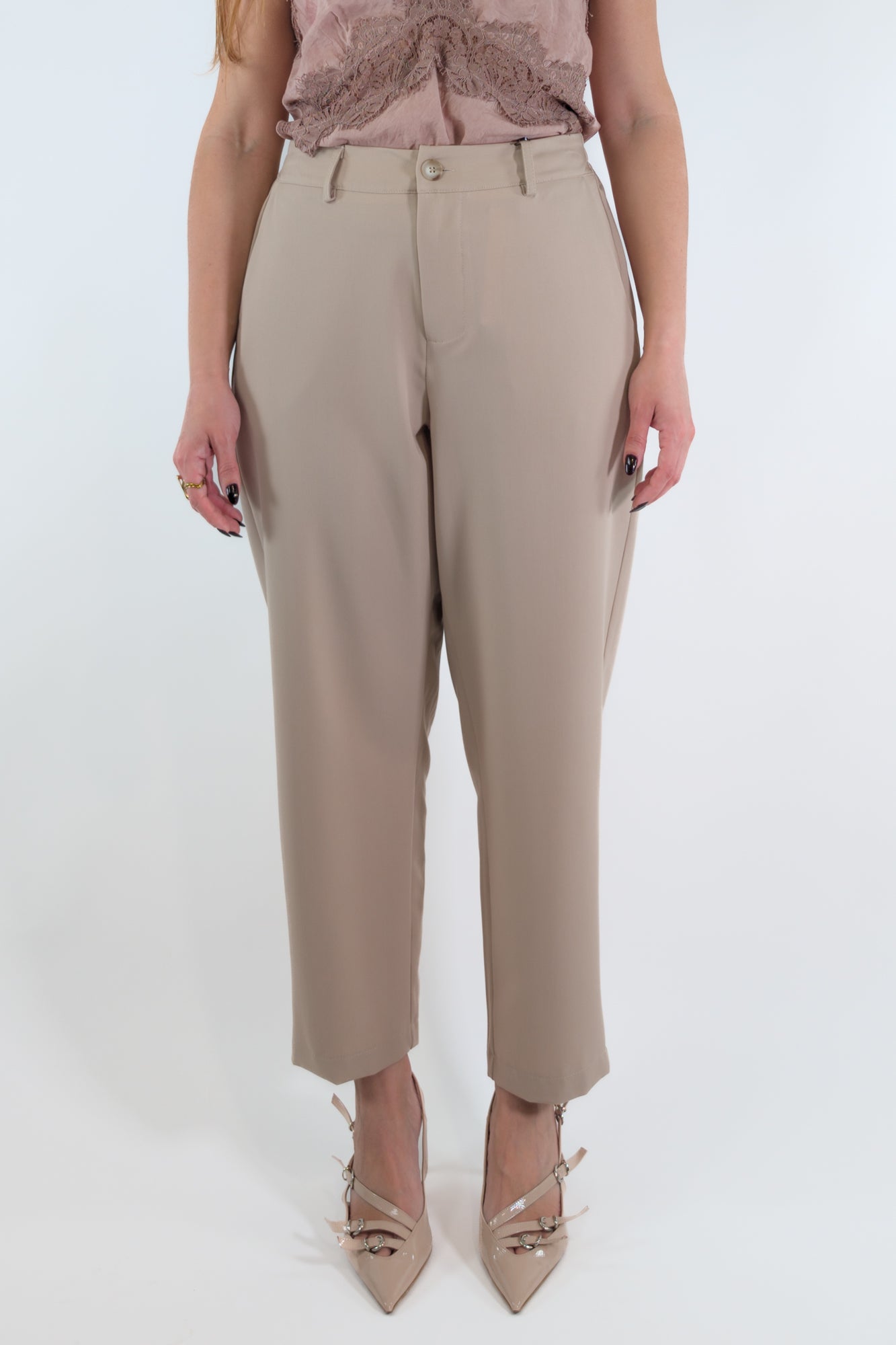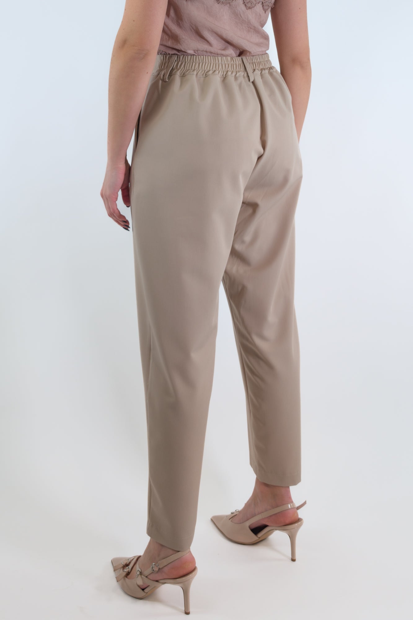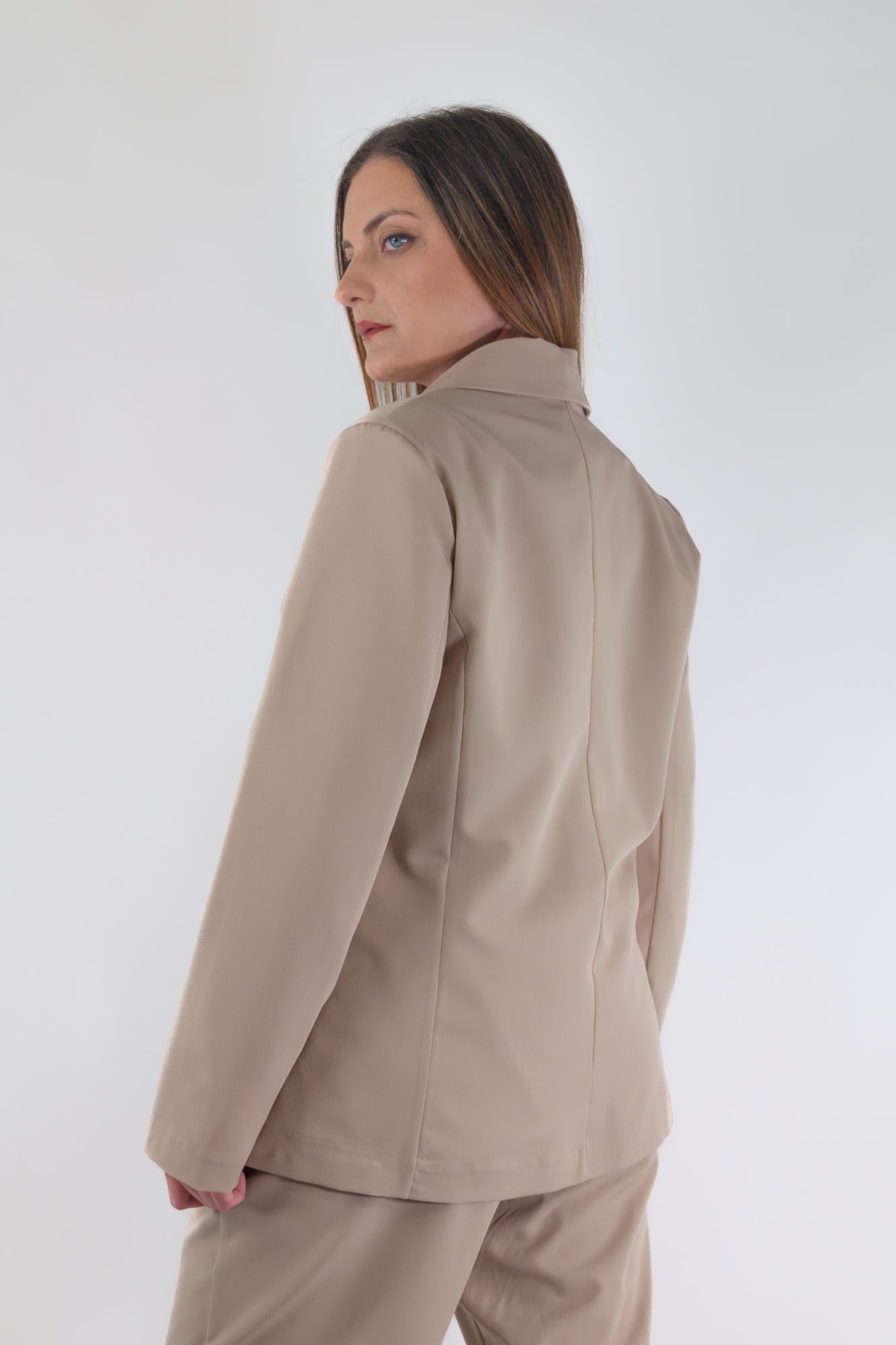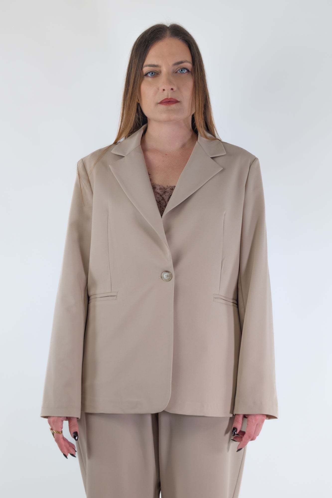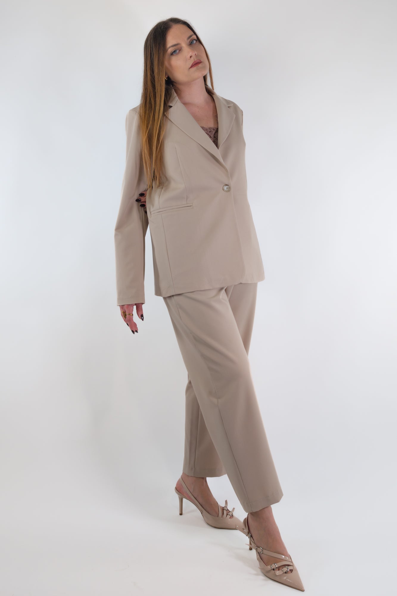 Tailleur composto da giacca monopetto e pantalone con elastico in vita.
