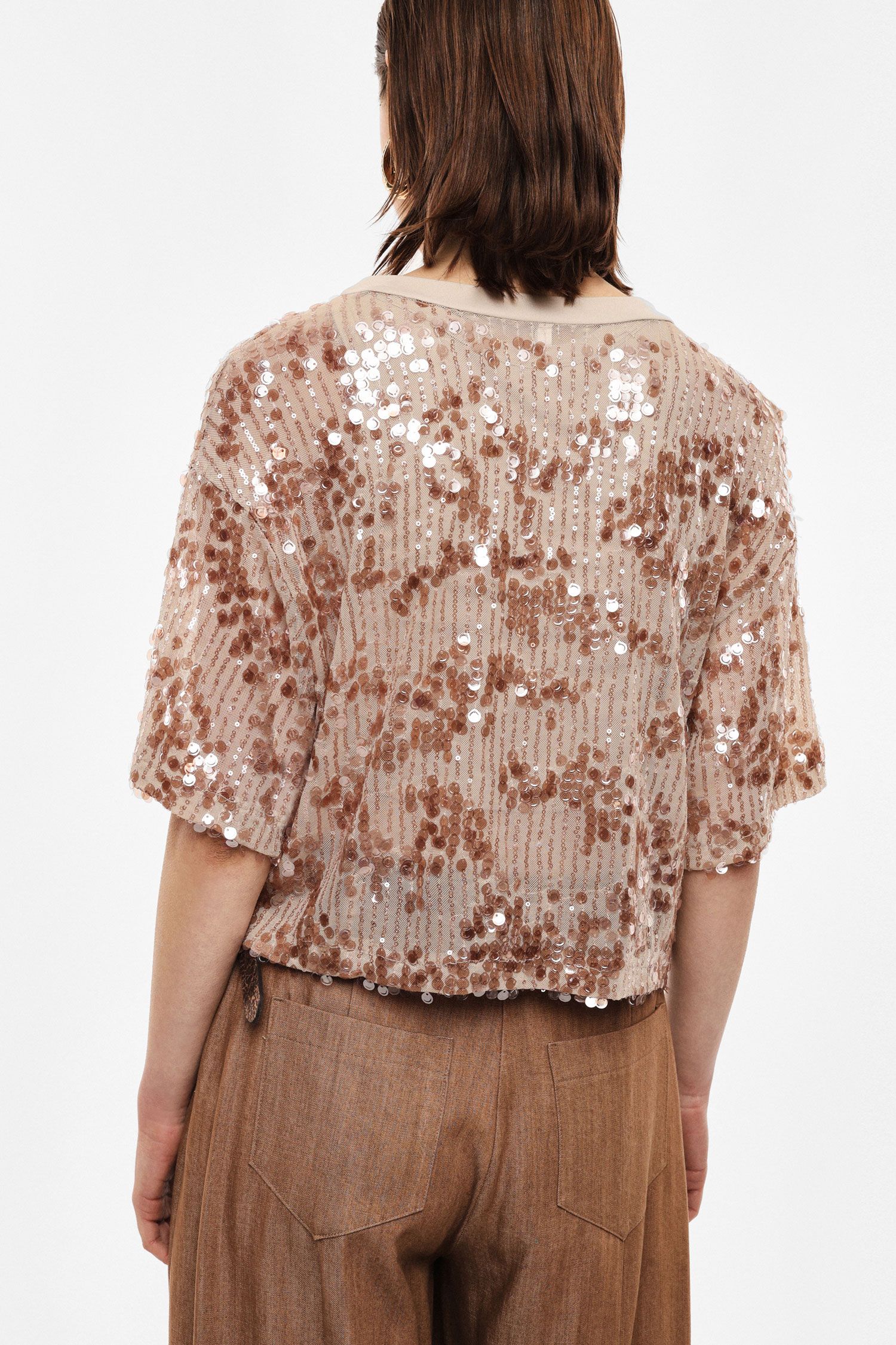 T-shirt girocollo a maniche corte decorata con una raffinata pioggia di paillettes che donano una luminosità particolare al capo. Ideale per chi desidera esprimere creatività e personalità attraverso dettagli ricercati. Linea versatile che si adatta sia a look urbani che ad abbinamenti sofisticati.