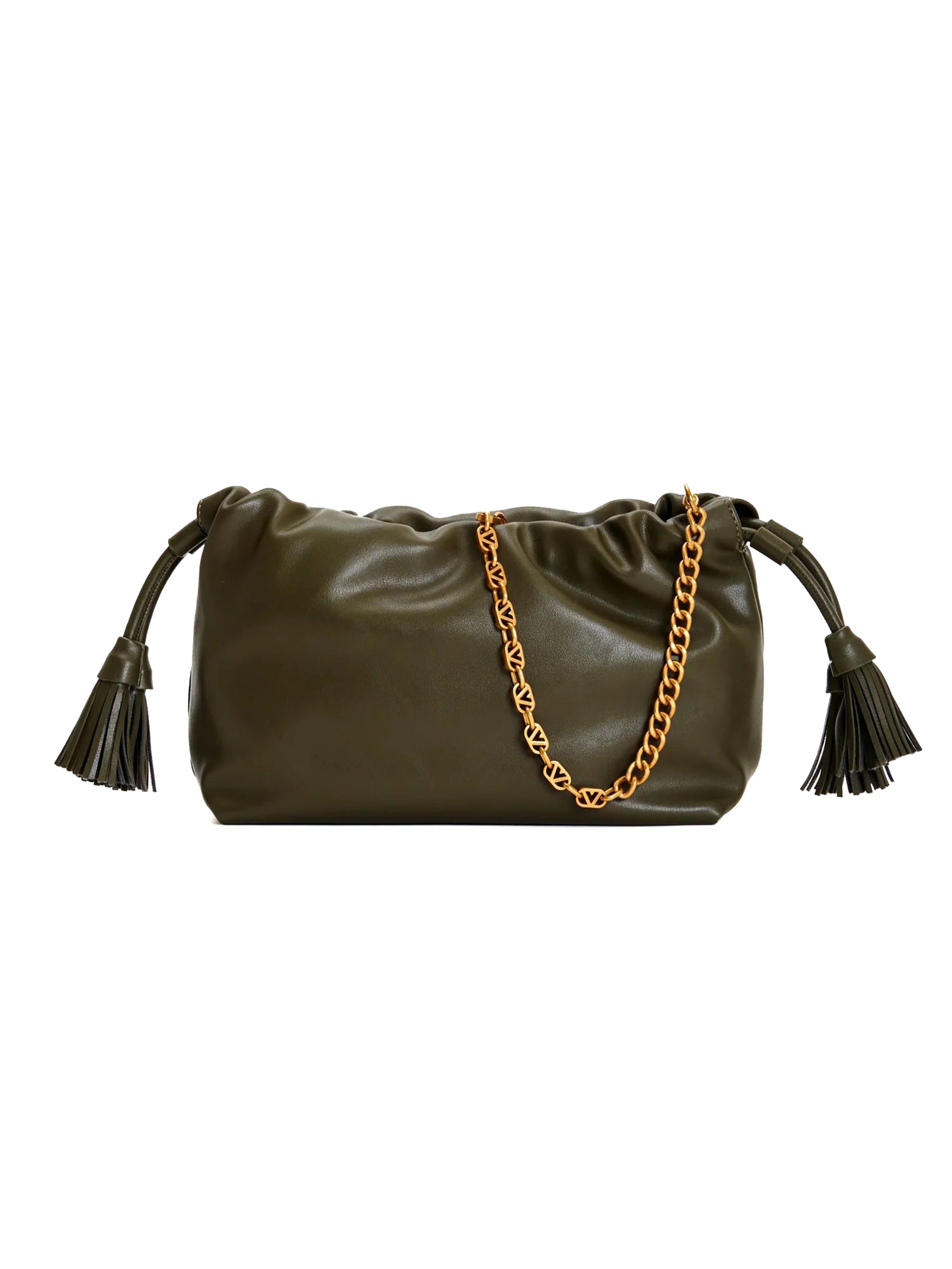 Borsa Tasselbag Small in ecopelle a spalla. Dettaglio rouches sul bordo. Chiusura con bottoni a pressione con calamita e coulisse in ecopelle con nappine. Dettaglio tracolla catena V metal plate Vicolo removibile. Tasca interna con cerniera e taschina piatta. Dettagli in metallo color oro.