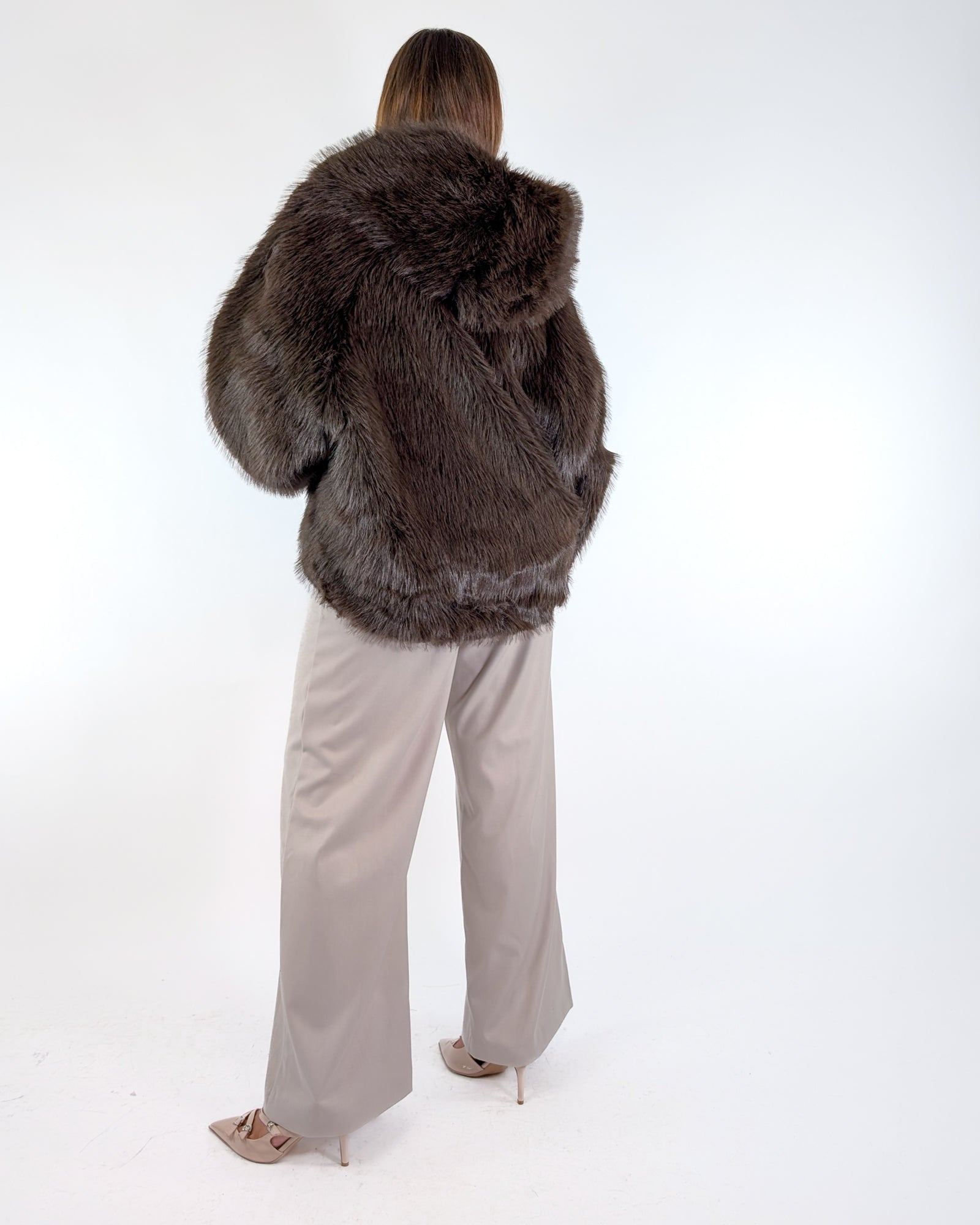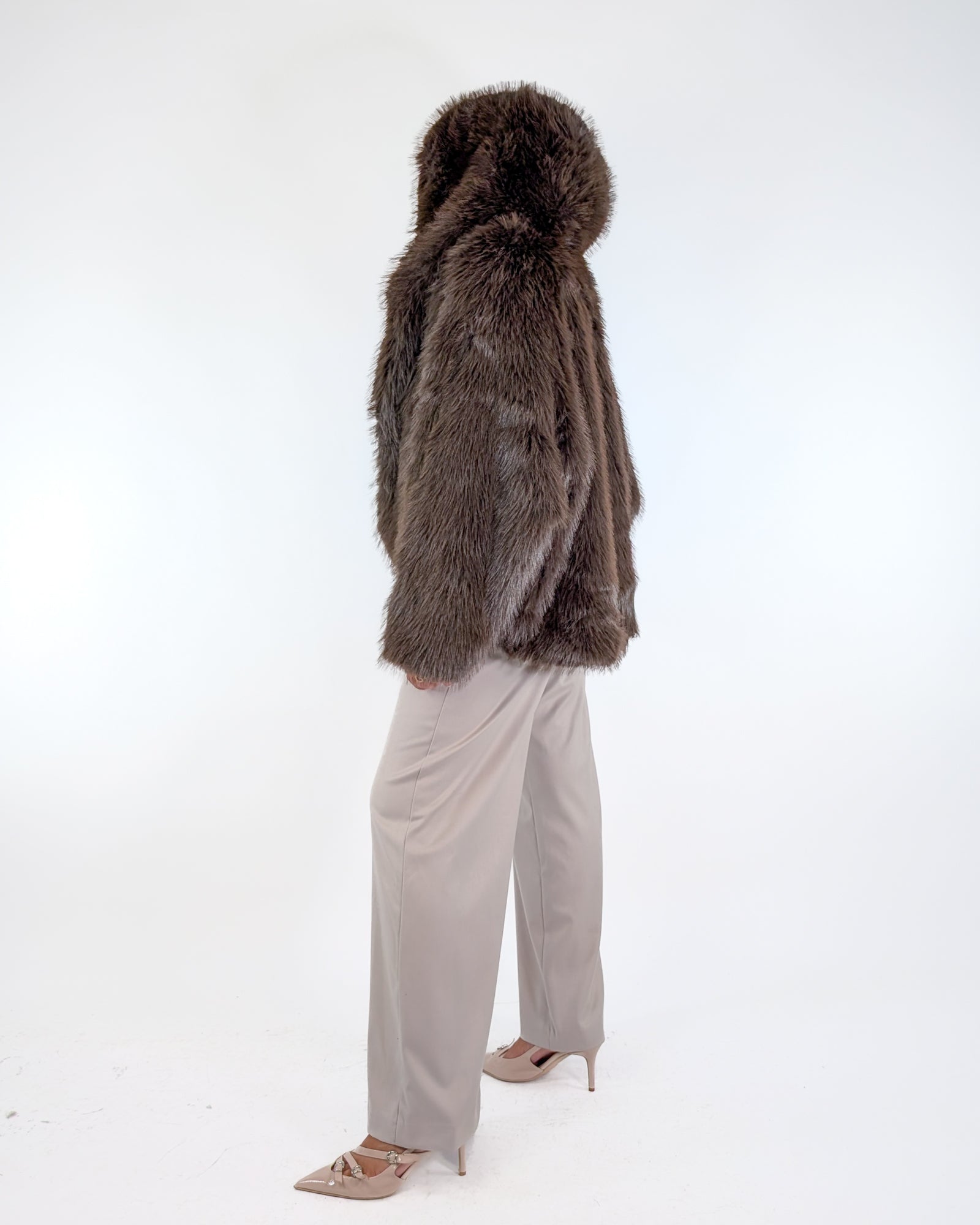 Ecopelliccia con cappuccio e chiusura a gancetto.