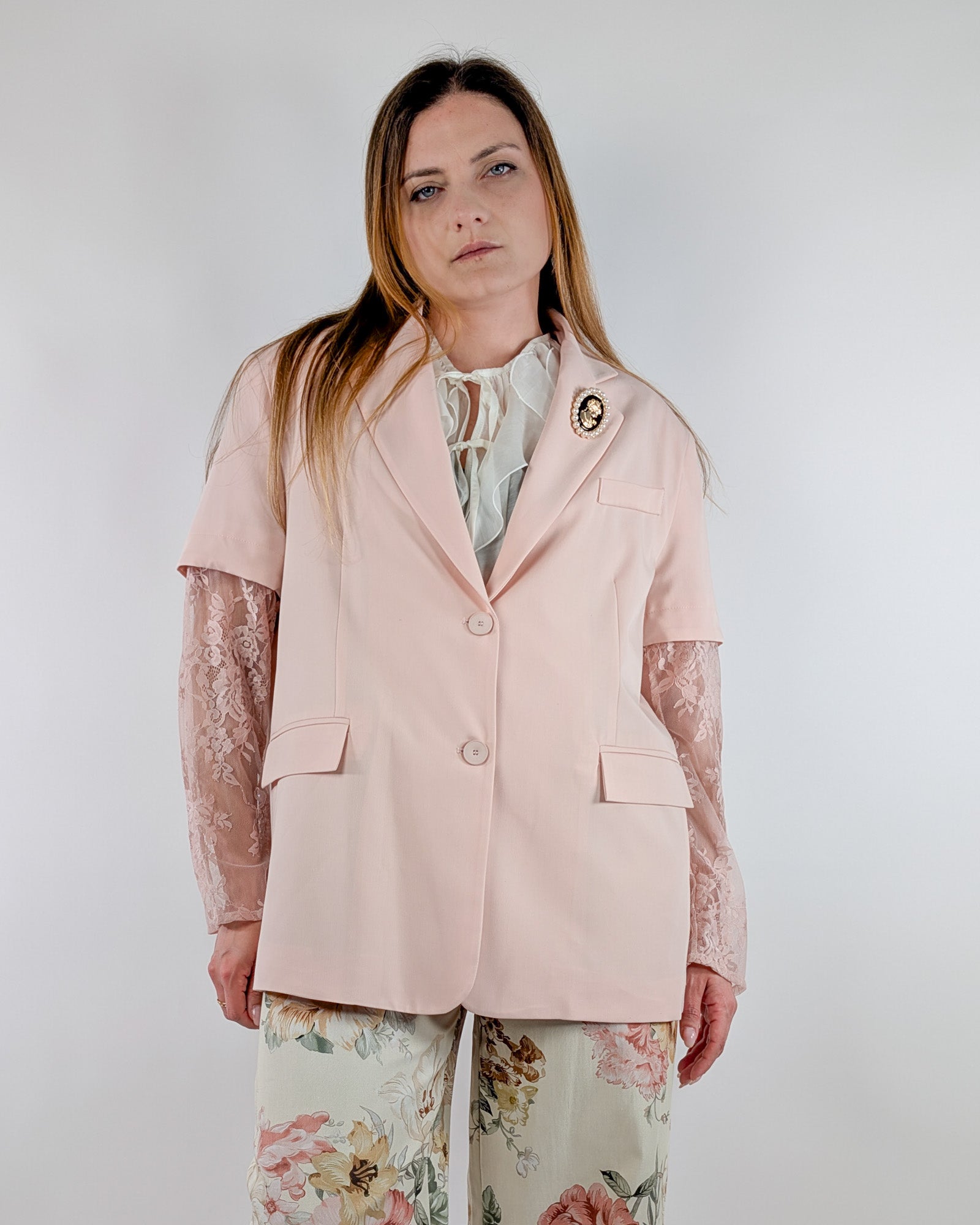 Giacca con maniche in pizzo e spilla cameo.